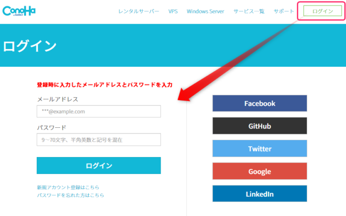 Conoha公式ページの上段メニューからログインページへ進み、ログイン!