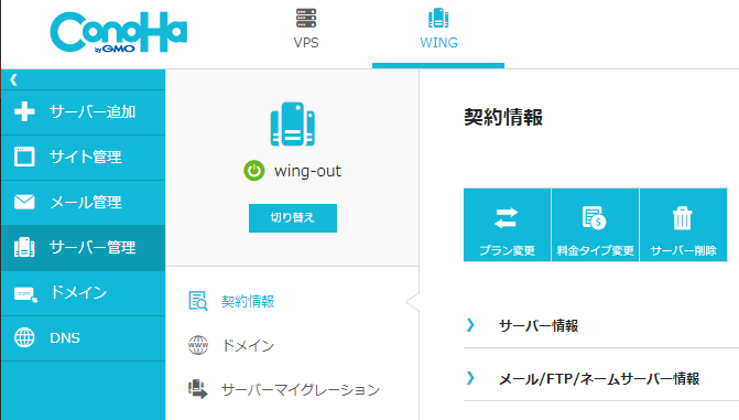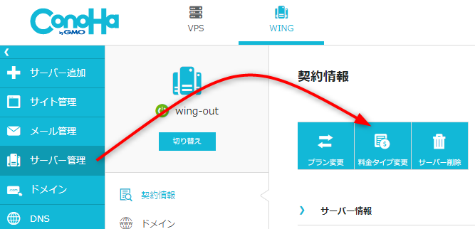 「サーバー管理」から「料金タイプ変更」に進みます。
