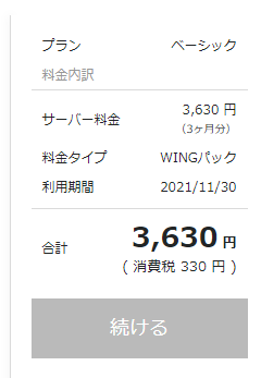 Conoha WINGは無料お試し期間がないので、その代わり、最初は時間課金(1時間2.2円)で新規契約して、3日ほど使って約150円程度払ったのち、
