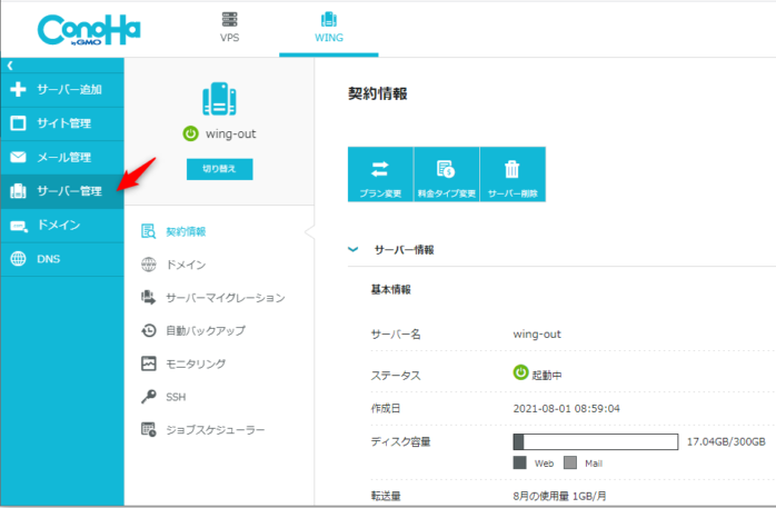 支払いが完了したら、サーバー管理に進んでみましょう。