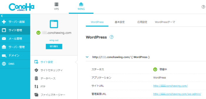 契約時にWordPressかんたんセットアップをやっていた場合は、「サイト管理」→「サイト設定」に進めば、インストールしたWordPressサイトに早速アクセスできます。