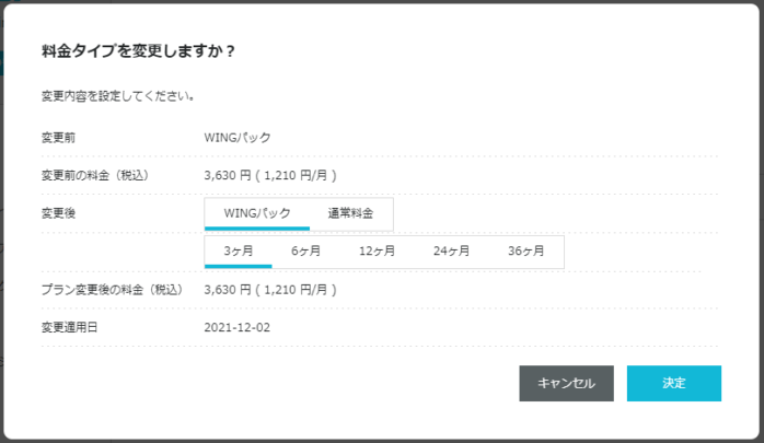 次の画面で、WINGパックを選んで、決定を押せば、パック料金に切り替わります。