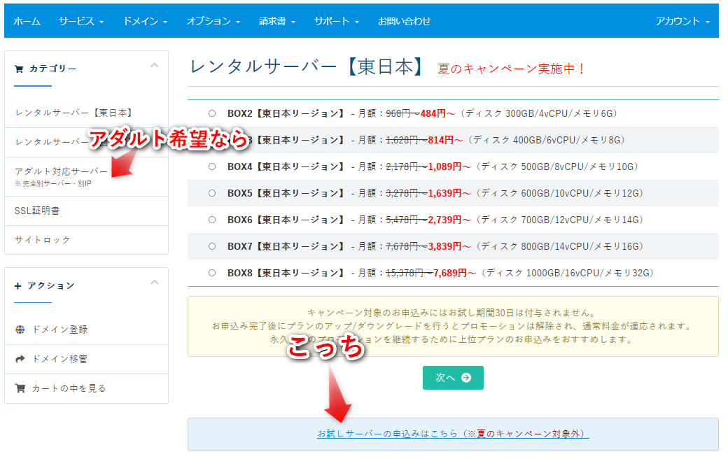 で、別途、キャンペーンページから、新しくサーバーを申し込みます。