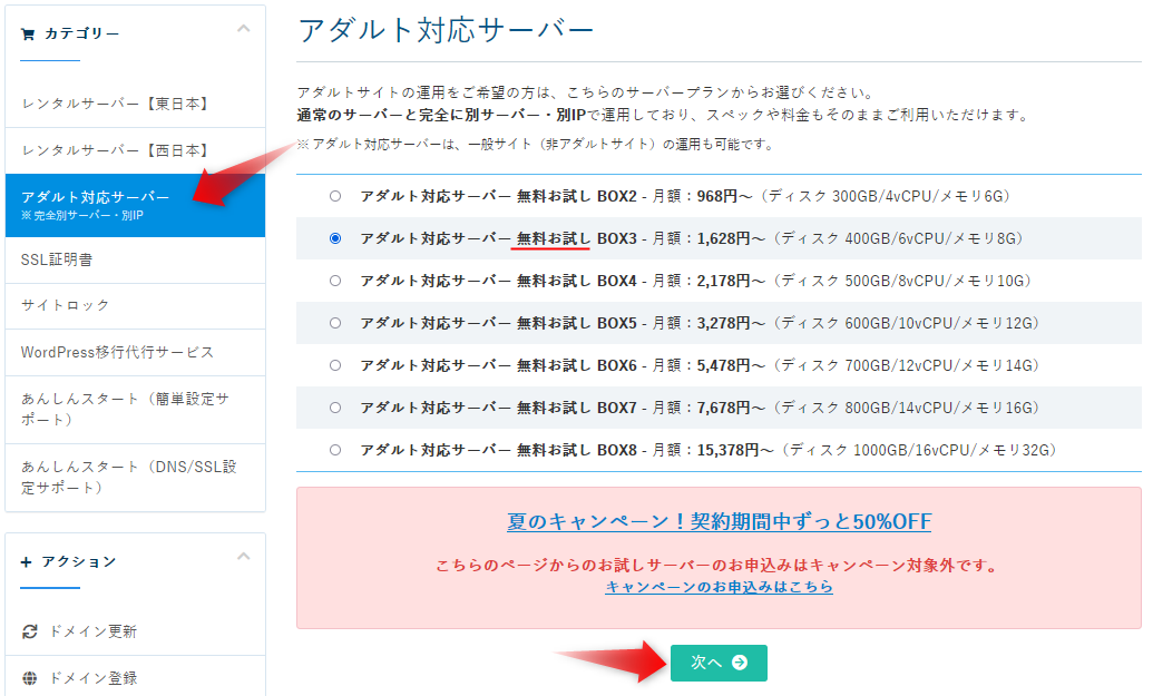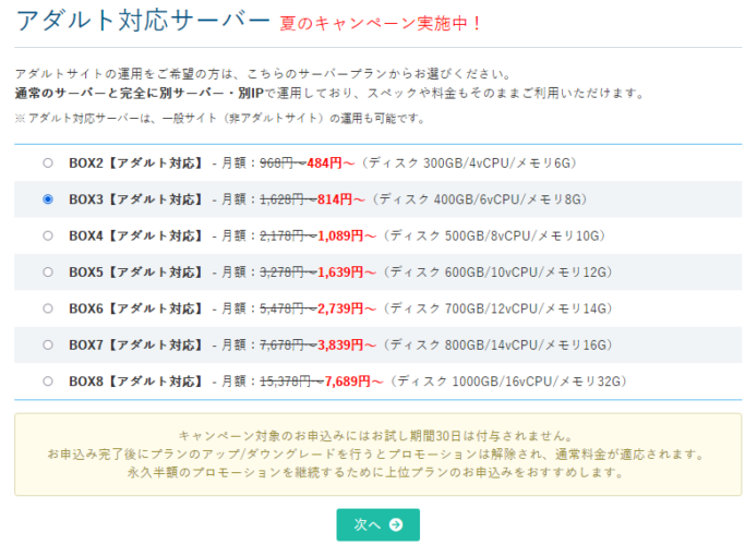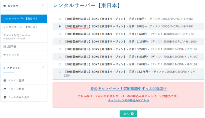 キャンペーンの価格一覧が出るので、契約したいサーバーを選んで、「次へ」