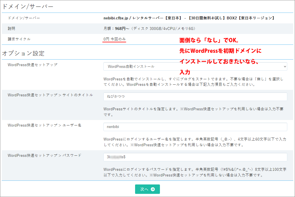 この画面でWordPressをインストールするか聞かれるので、今やるのが面倒であれば「なし」で。お試し開始と同時にすでにインストールされた状態にしたいなら、サイトタイトル、ユーザー名、パスワードを自分で考えて入力します。(WordPressは初期ドメインにインストールされます。)