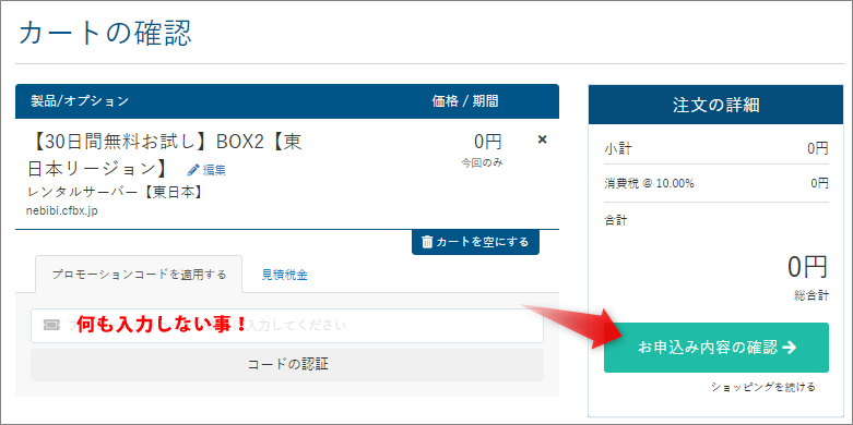 カートの確認画面が出ます。「プロモーションコードを適用する」の欄には、何も入力しないでください。(クーポンコードは本契約の時に入力します。無料期間では入力しません。)