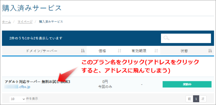 表示されているプラン名をクリックします。(〇〇.cfbx.jpをクリックするとそのアドレスに飛んでしまうので、あくまでプラン名をクリック)