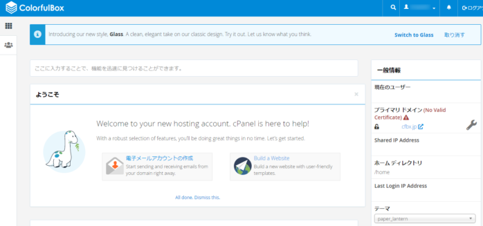 この画面(cPanel)で、サーバーの全操作ができます。これで無事お試し利用ができます。おめでとうございます!