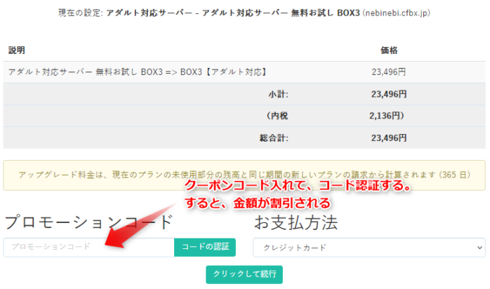 ここで、クーポンコードを入れます。コードの認証を押して、ちゃんと料金が割引価格に変わるか確認してください。クーポンの期限切れと出た場合は、TOPページから別のクーポンやキャンペーンを探してみましょう。