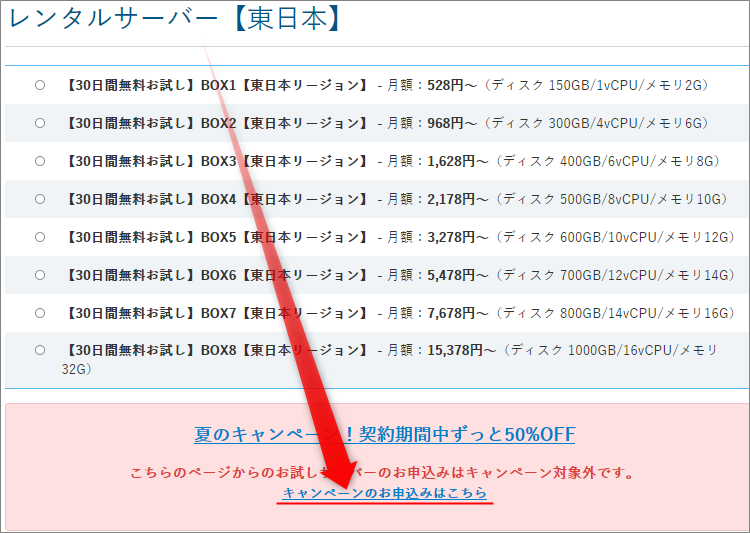 無料お試しサーバーとは別にキャンペーンから申し込む場合