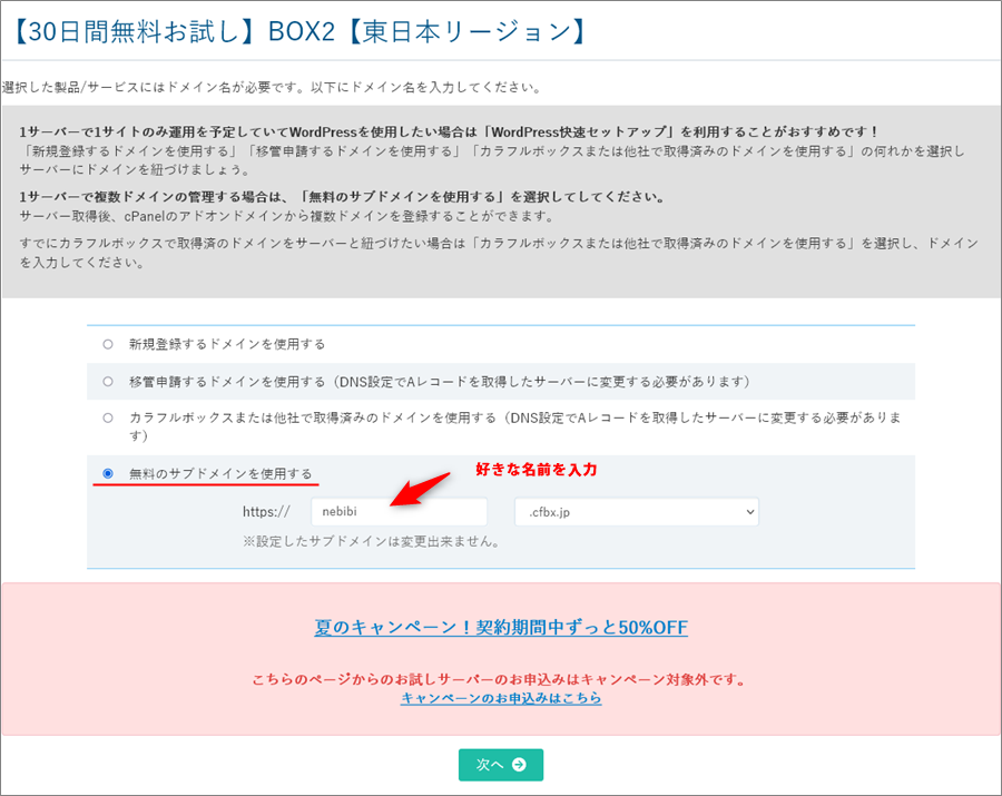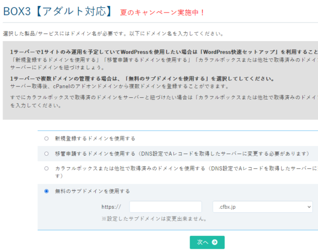 次のページでは、必ず「無料のサブドメインを使用する」を選んでください。じゃないと、複数WordPressをインストールする事が困難になりますし、無料の初期ドメインがもらえなくなり不便です。