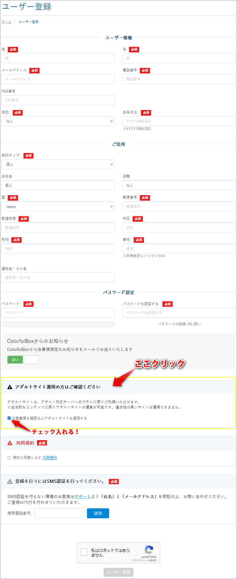 で、必ず上図のように、「アダルトサイト運用の方はご確認ください」の欄をクリックして、チェックを入れます(これで進めるようになる)。そして、ユーザー登録を完了してください。