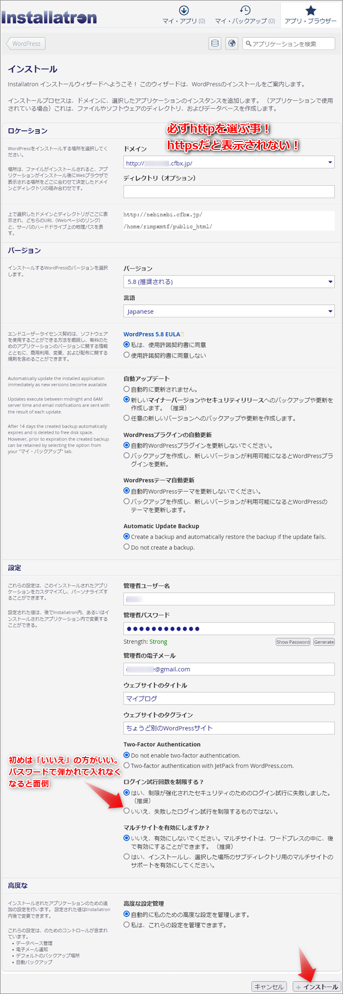 ドメインはhttpを選んでください。httpsでインストールすると、WordPressサイトが表示されない、ログインできないトラブルが起こります。というのも、初期ドメインや、紐付けていないドメインはhttpsは使えない状態だからです。(ただ、初期ドメインはインストール後10分程度経つと、httpsも使えるようになります。インストール時はhttpがおすすめです。)