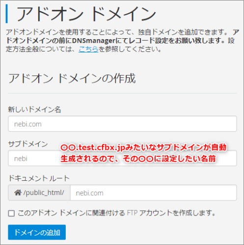 アドオンドメイン、もしくはサブドメインをセットする