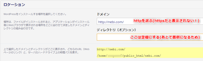 フォルダを作ってしまうと、WordPress自体がどこに本体がインストールされてるのか認識できないため、.htaccessをイジるという玄人向け作業をしないと、同じくWordPressが表示されないんです。なので、必ず空欄にしておきます。