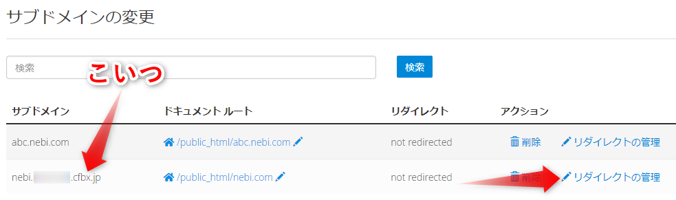このアドレスにアクセスしても、同じサイトが表示されるため、あまりSEO的によろしくありません。なので、「リダイレクトの管理」に進みます。