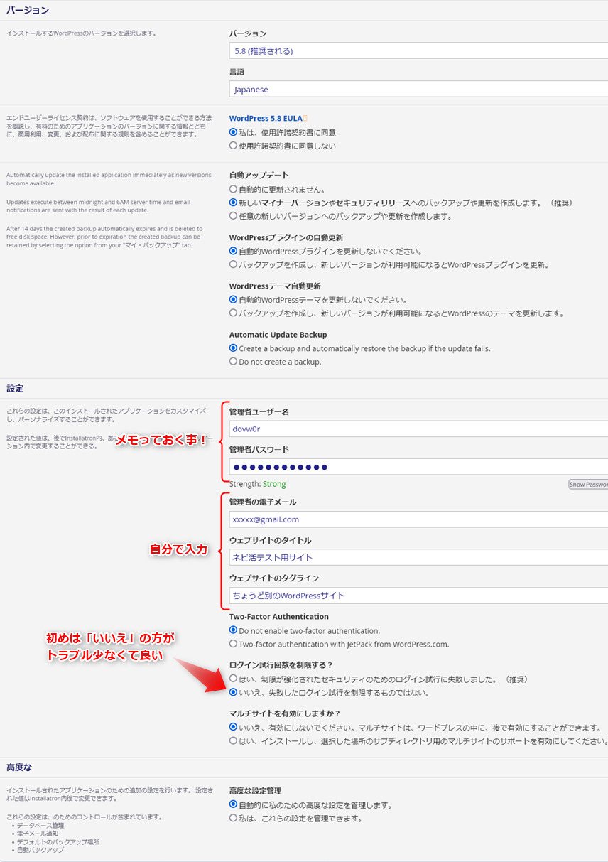 「ログイン試行回数を制限する?」に限っては、初めはよく「合ってるパスワードを入れてるのにクッキーなどの影響で入れない」とかあるんで、トラブル防止にOFFをおすすめします。実際にサイトを公開した時に、「Limit Login Attempts Reloaded」というプラグインを入れる事で、ログイン試行回数制限をして、セキュリティを高めればOKです。(というか、「はい」にすると、このプラグインが最初からインストされてONになるだけです。)