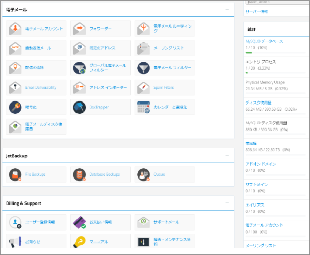 他にも、例えばMixhostやColorfulBoxなどのレンタルサーバーでは、cPanelというユーザーインターフェースを使ってます。こんな感じの奴です↓