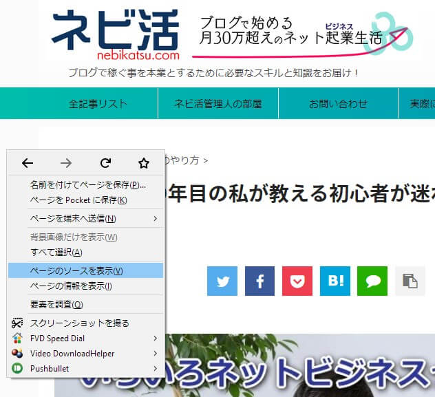 そこで、右クリックして「ページのソースを表示」を選びます。