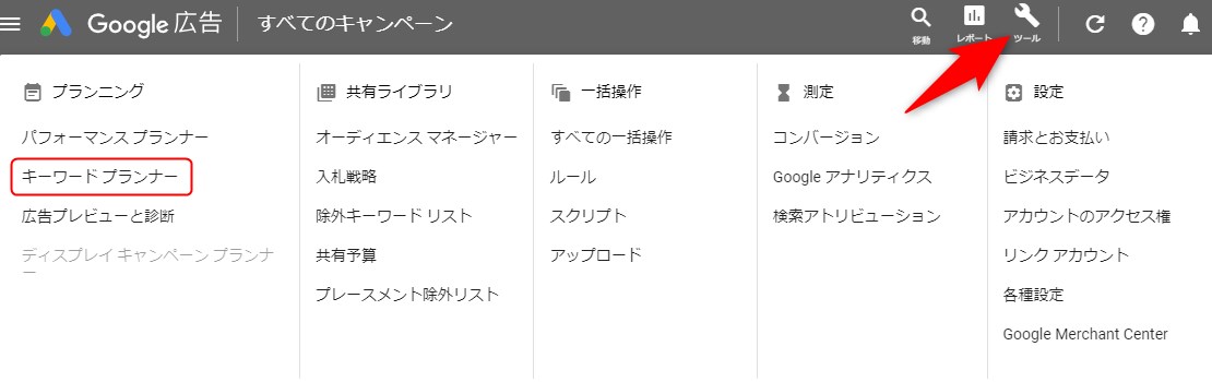 ログインが完了したら、「ツール(赤矢印の所)」を選び、キーワードプランナーを選択します。