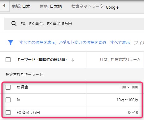 試しに「FX」「FX 資金」「FX 資金 5万円」という3つのキーワードを入力してみます。