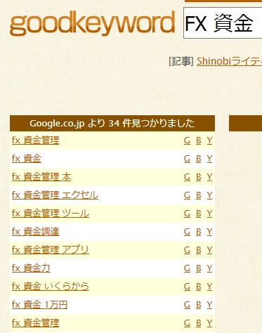 まずは、先ほどのgoodkeywordサイトを使って、関連キーワードを探していきます。