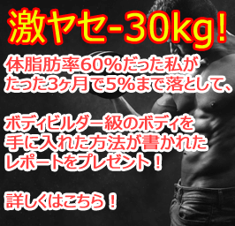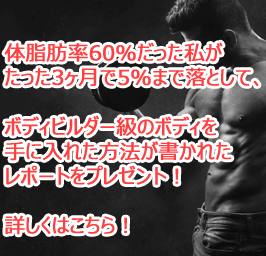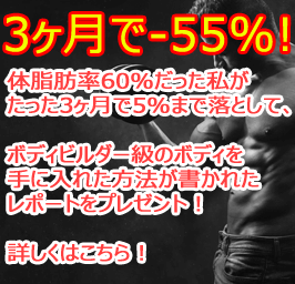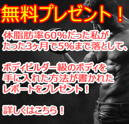 「体脂肪率60%だった私がたった3ヶ月で5%まで落として、ボディビルダー級のボディを手に入れた方法が書かれたレポートをプレゼント!詳しくはこちら!」