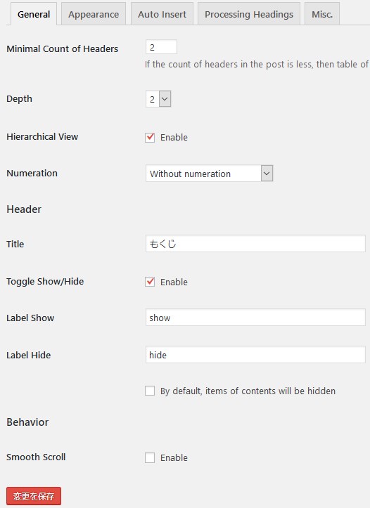 Minimal Count of Headers:目次を自動で作る最小の見出しの数。例えば3つ以上見出しがあるページだけ自動で目次を表示したいなら、3と入力します。