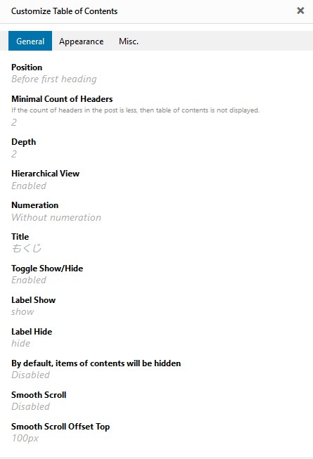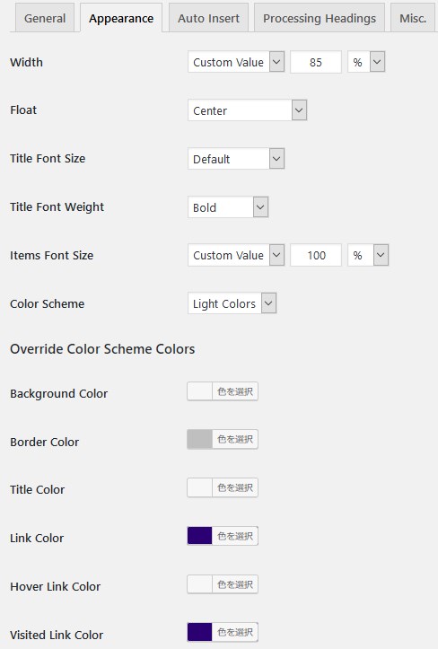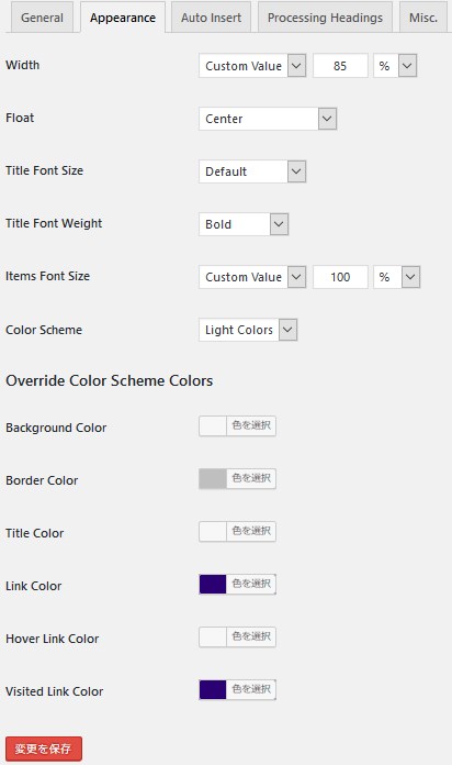 Appearanceタブは見た目の設定です。ここで目次の幅や色、文字の大きさ、文字色などを設定出来ます。
