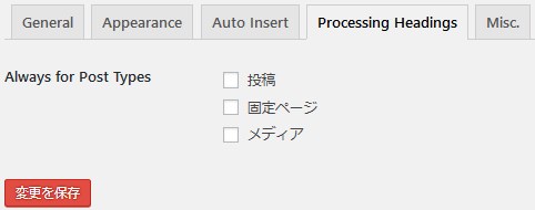 Processing Headingsタブは、チェックを入れたページタイプは、目次があろうがなかろうが、全部の見出しにアンカータグが自動付与されます。
