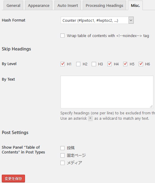 Hash Formatは、アンカータグをタイトルの英字ベースにするか、数字降順ベースにするかを決められます。