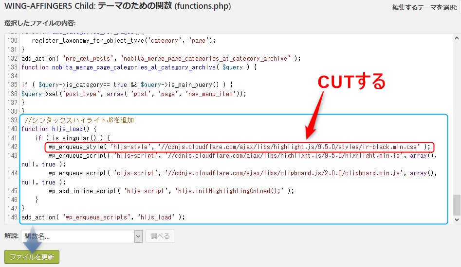 赤文字部分をカット(コピーして削除)する、そしてfunctions.phpは保存する
