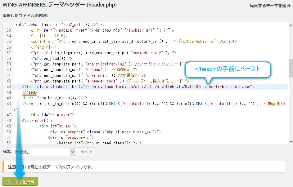 3. そして、このタグをheader.phpの</head>の手前にペーストして保存します。