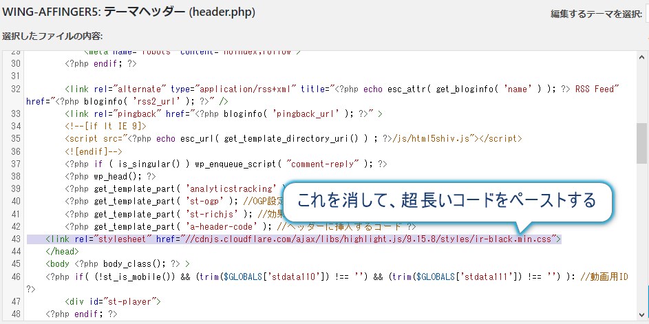3. 今作った超長いコードを元のheader.phpに書かれていたものと入れ替えます。