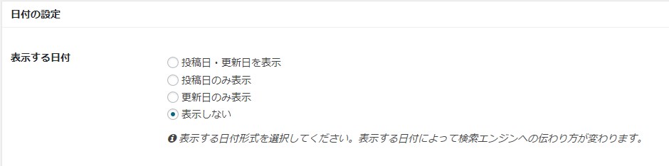 • 旧テーマを使ってた時は、投稿日や更新日をdisplay:none;などで隠してたり、Googleには通知しない設定にしてたけど、新テーマの設定は、投稿日や更新日を通知するようになった。