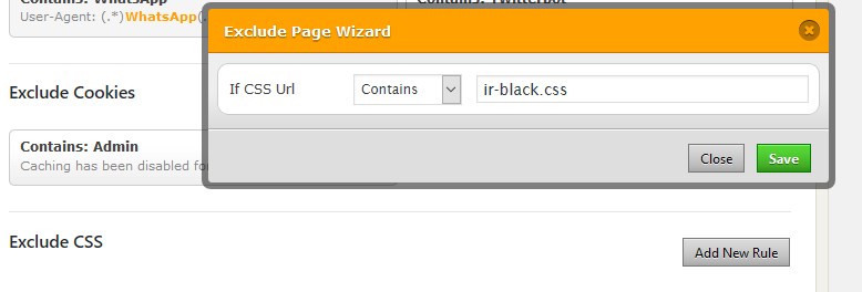 上の画像のように、入力欄が出てくるので、例えば、ir-black.cssというcssファイルだけ高速化から除外したいなら、上のように入力する事で除外されます。(Containsとは「含む」の意味)