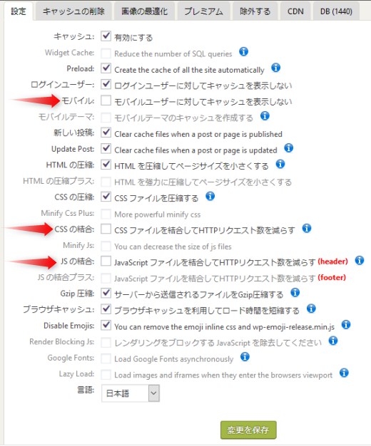 JSの結合:これも高速化するのに効果的なのですが、Javascriptの結合は不具合が出やすい(ボタンなどのギミックが動かなくなったり、画面が真っ白になりやすい)ので、こちらもプラグインキャッシュ、ブラウザキャッシュの両方を消した後に、スマホ、PC、両方から自分のブログにアクセスしてみて、不具合がないかをチェックしてみてください。特にスマホから固定ページにアクセスしてみて、ボタン類、お問い合わせフォーム類に不具合が出てないかもチェックです。