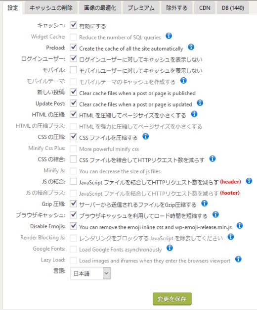 CSSの結合:これはそんなに不具合は出ないので、ONにする事でさらなる加速が狙える項目です。一度ONにして、「Delete cache & minified CSS/JS」の後、(ブラウザのキャッシュも消した)ブラウザから自分のブログを見て、問題がないか確認してみると良いです。