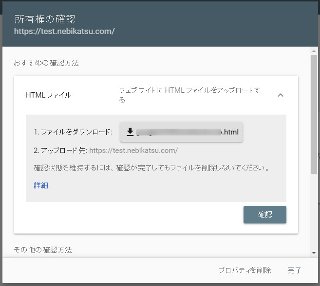 HTMLを使う場合は、「googlexxxxx.html」っていうファイルをダウンロードしたら、