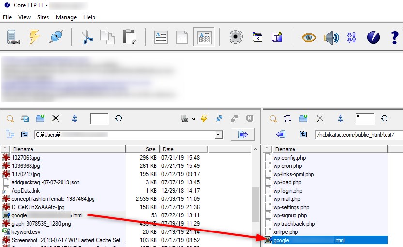 それをFTPを使って、WordPressの「wp-config.php」が入ってる所と同じ場所にアップロードします。
