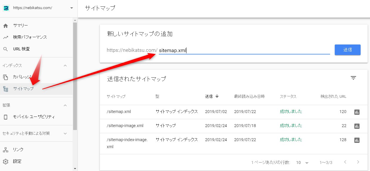 サイト登録が済んだら、今度は、サイトマップをサーチコンソールに送信する作業をやります。