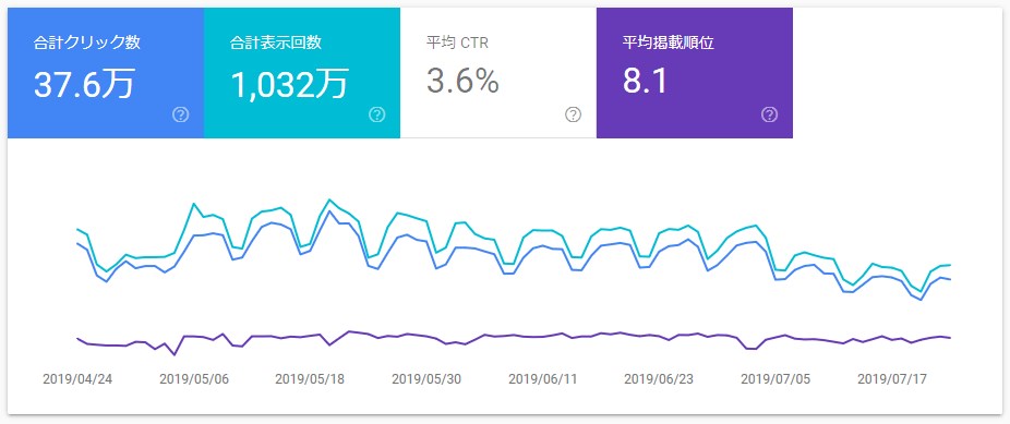 ようは、このグラフの「合計クリック数」「合計表示回数」「平均CTR」「平均掲載順位」全部クリックして、白→色付きに変えれば、全部表示されるって事です↓