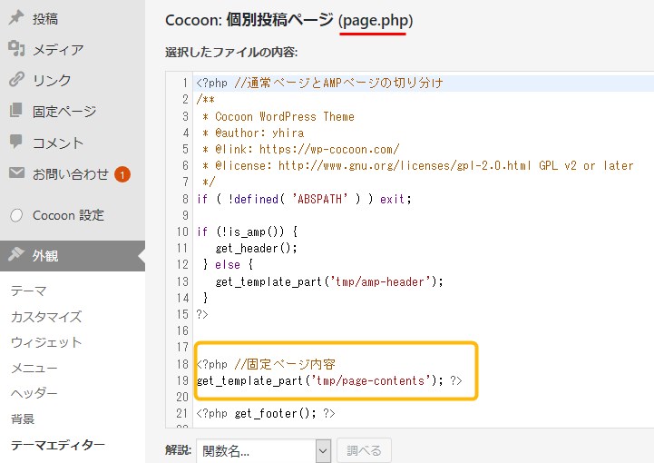 ↑get headerからget footerの間にあるのが、本文部分を呼び出す要素なので、それをコピペして上のコードの代わりに使うとうまくいきます。(画像のCocoonの例なら、黄色枠をコピペして、本文タグ、本文閉じタグ、get_sidebarタグを削除すると、綺麗に表示されます。)