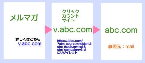 例えば、メルマガから abc.com にお客さんを飛ばす場合は、