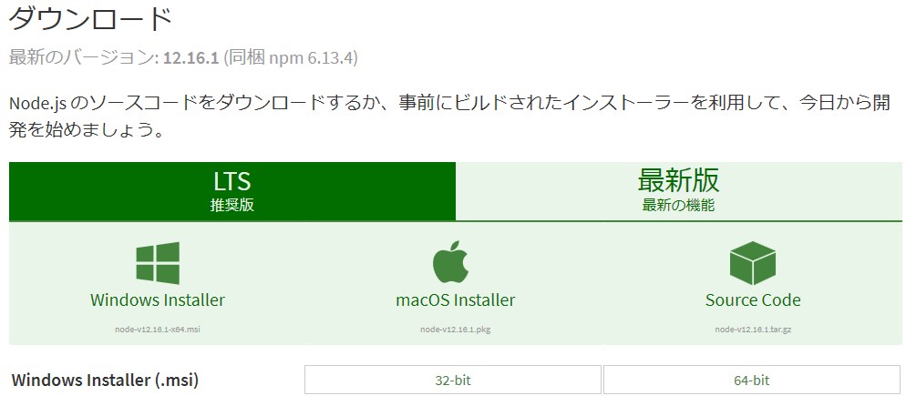基本的には、LTSのInstaller(.msi)を選べばOK。32bitか、64bitかは、自分のPCがどっちか調べて、合ってる方をインストール。