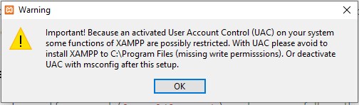 何を言ってるかというと、普段Windowsにソフトをインストールする時はCドライブのProgram Filesというフォルダにインストールしますよね?でもXAMPPはそこにインストールするとトラブる事が多いから、別の場所にインストールしてくれって言ってます。OKを押してください。