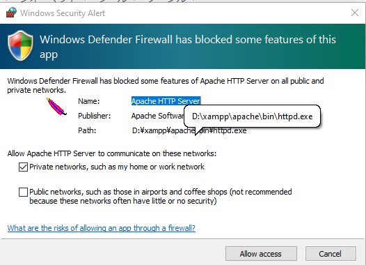 そしてインストール中、こういう警告文が出ます。プライベートネットワークだけチェックを入れてアクセス許可してください。