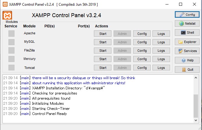 こういうXAMPPコントロールパネルが出てくれば、これでXAMPPのインストールは無事完了です。