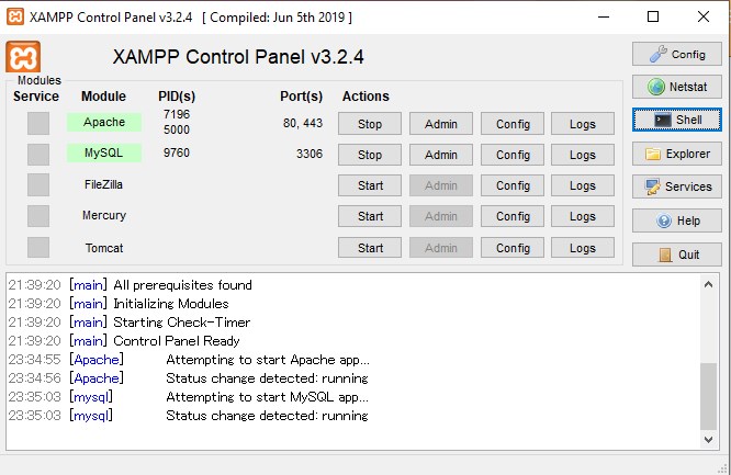 では、XAMPPコントロールパネルのApacheとMySQLのStartボタンをそれぞれ押してください。