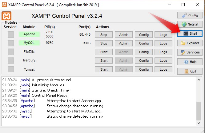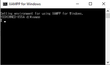 次に、同じXAMPPの画面にある「Shell」を押して起動します。Shellは基本的にはCommand promptと同じです。